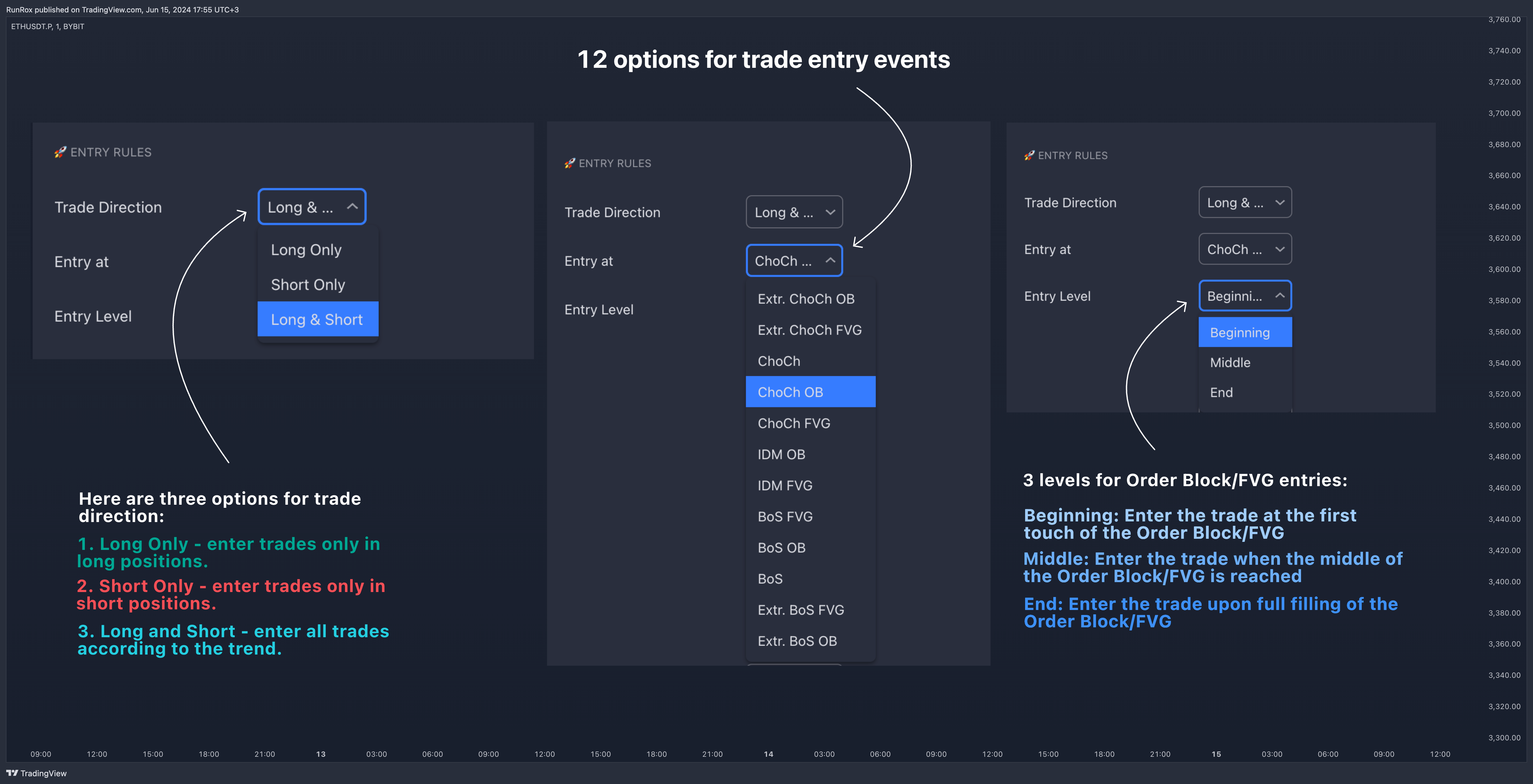 Middle: Enter the trade when the middle of the Order Block/FVG is reached End: Enter the trade upon full filling of the Order Block/FVG *Three levels work only for Order Blocks and FVG. For trade entries based on BOS or CHoCH, these settings do not apply as these parameters are not available for these types of entries You can choose any combination of trade entries imaginable.