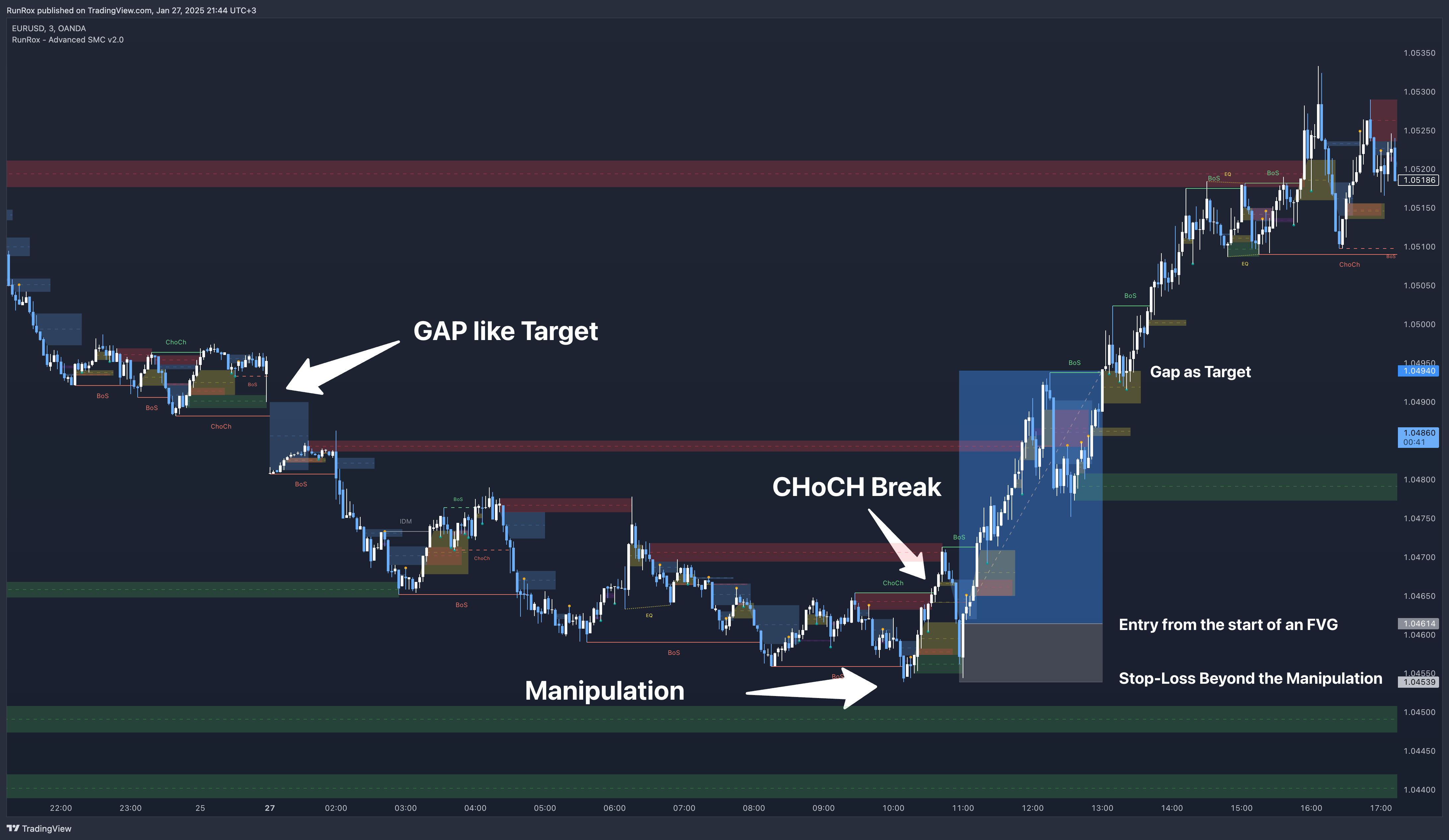 This is considered a more aggressive entry because we only waited for a single confirmation of the trend change—the CHoCH break—and then entered immediately afterward. While the WinRate might be lower in such trades, the Risk-Reward ratio is typically very high if you correctly identify the manipulation.