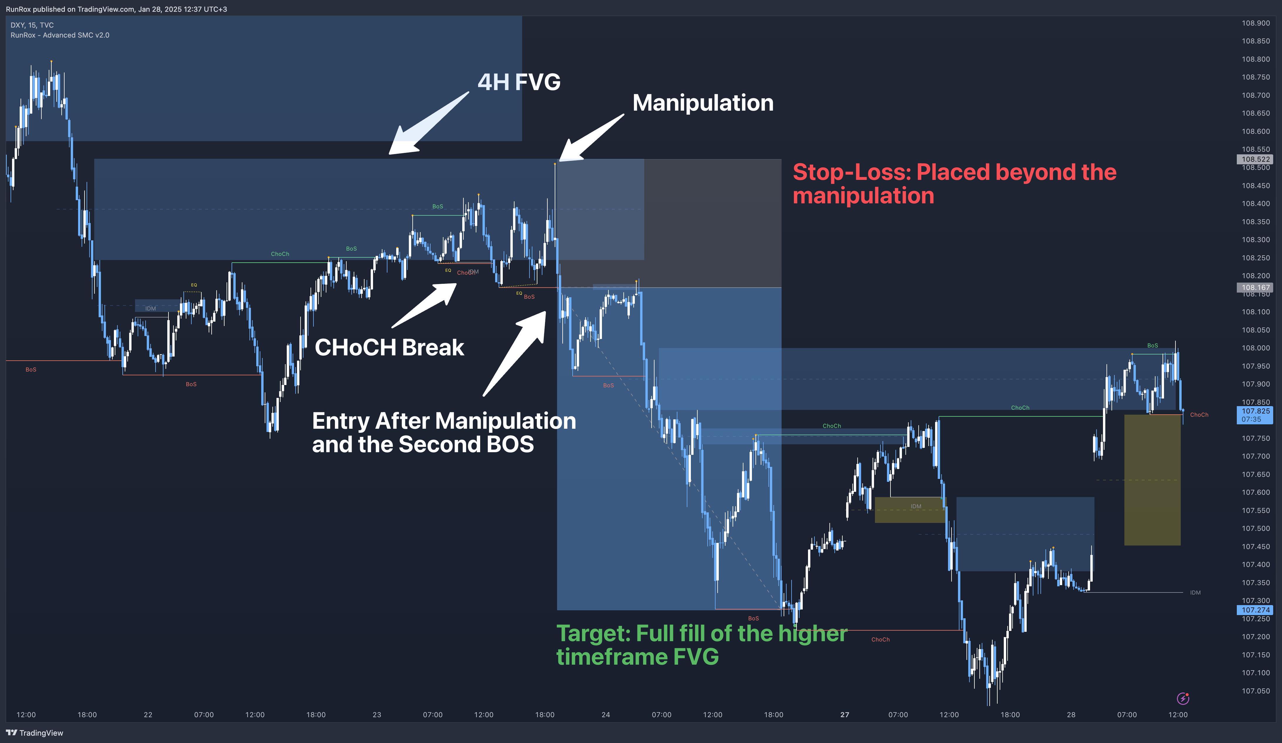 Our target is the full fill of a higher timeframe FVG or other high-liquidity levels below.