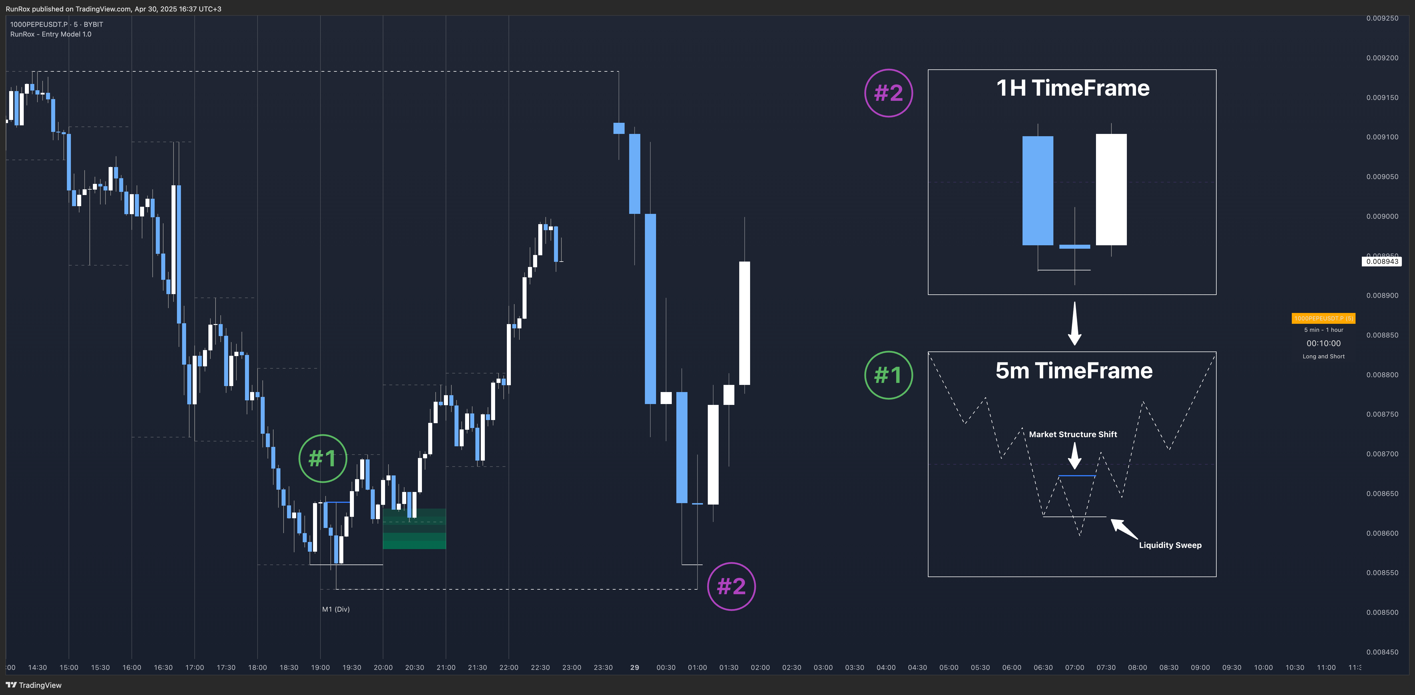 In the screenshot below, I’ll schematically illustrate the core idea of this indicator. It’s one of the patterns that the indicator automatically detects on the chart using a two-timeframe approach. We use the higher timeframe to identify liquidity zones, and the lower timeframe to capture liquidity removal and structure breaks. The schematic is shown in the screenshot below.